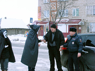 Необычность акции состояла в том, что волонтеры в образе «Смерти с косой» и «ангелов Смерти» стояли у разбитой машины, которая побывала в дорожно – транспортном происшествии. Участники акции должны были психологически повлиять на водителей транспортных средств, чтобы они изменили свое отношение к «лихачеству» на дороге.