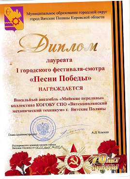 Наше образовательное учреждение с песней «Когда б мы были на войне» представлял творческий коллектив «Майские переливы». В его состав вошли: директор техникума О.М.Мельников, заместители директора О.Л.Овчинникова и Н.В. Шешегова, начальник ЦИТ М.А.Заикин, преподаватель Л.Г.Матвеева, студент группы 1 ТМ А.Стяжкин. Подготовила творческий коллектив преподаватель сольного и ансамблевого пения МБОУДОД «Детская школа искусств» г. Вятские Поляны Н.В Носова.
