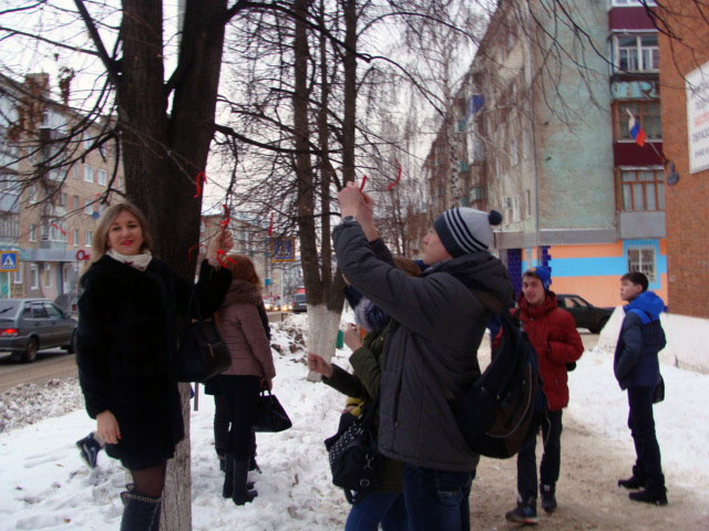 В конце мероприятия студенты завязали красные ленточки- (символ этого дня) на деревьях у стен техникума в знак солидарности с теми, кого эпидемия СПИДа затронула лично.
