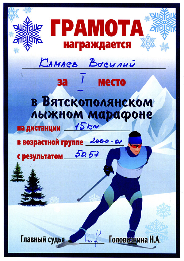 25 марта в Вятскополянском лыжном марафоне на дистанции 15 км в своей возрастной группе 2000-2001 г.р. студент группы 2 СП Камаев Василий занял 1 место.