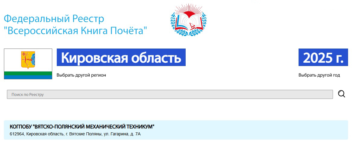 Вятско-Полянский механический техникум включен в Федеральный Реестр «Всероссийская Книга Почета - 2025»